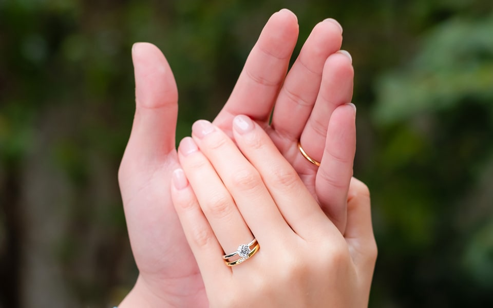 婚約指輪は「婚約の証として贈られる」もので、結婚指輪を交換するまで身に着けるのが一般的ですが、結婚後の着用も問題ありません。結婚後も、婚約指輪と結婚指輪を重ね着けする、シーンに応じて指輪を使い分けるなど、さまざまな楽しみ方ができます。