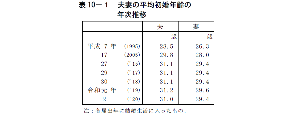 厚生労働書による令和2年(2020)人口動態調査では、平均初婚年齢は夫 31.0 歳で前年の 31.2 歳より低下し、妻は 29.4 歳で前年の 29.6 歳より低下しています。