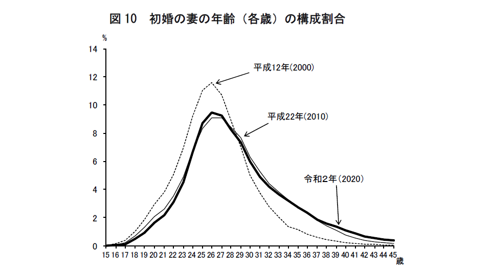つまり、26~27歳で初婚をする人が最も多く、この割合は20 年前とあまり変化はありません。