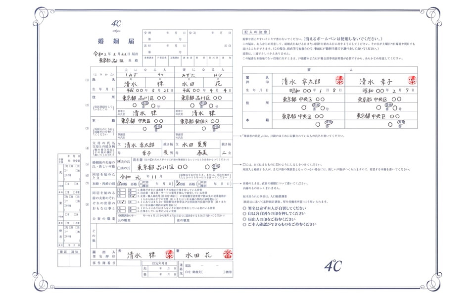 婚姻届を書いている段階では、まだふたりは法的には夫婦ではありません。そのため、押印や修正印をする際にはふたりの「旧姓の印鑑」が必要です。